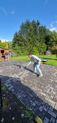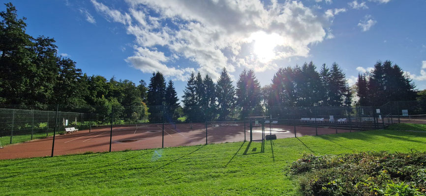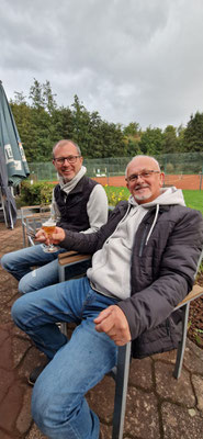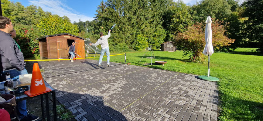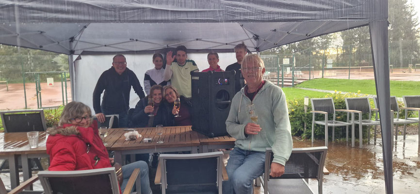 Ab 14 Uhr wären eigentlich die Erwachsenen beim Mixed-Turnier dran gewesen. Doch Regen, Sonne und Pfützen machten die Plätze unbespielbar. Aber auch dafür gab es eine Lösung: Spontan wurde ein Mini-Netz auf der Pflasterfläche aufgebaut – Kleinfeld-Action vom Feinsten - nicht nur Marc und Peter spielten sich hier die Gänsehaut weg, auch Familie Minch hat sich warm gespielt... Wer sich zwischendurch doch mal in die Sonne wagte, wurde nach wenigen Minuten vom nächsten Schauer zurück ins Clubhaus getrieben.